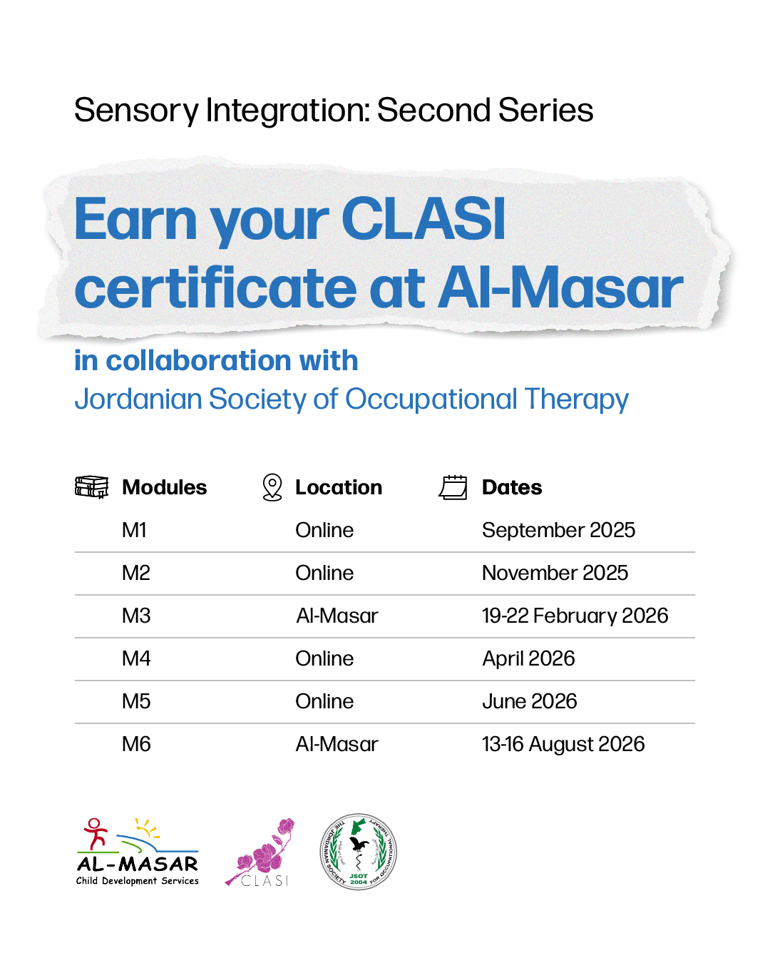 In our commitment to advancing evidence-based interventions in the region, we have partnered with the Collaborative for Leaderships in Ayres Sensory Integration (CLASI) to offer regular training opportunities in collaboration with Al-Masar. Together, we host the Certificate in Ayres Sensory Integration (CASI), a comprehensive six-module hybrid program. The program includes four self-paced online modules and two in-person modules focused on hands-on practice, providing participants with direct mentoring and personalized feedback.